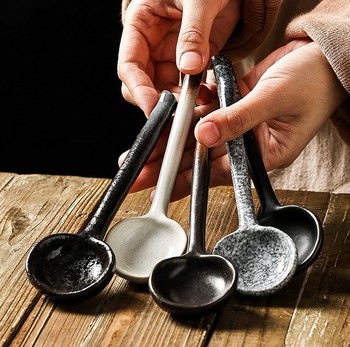 Cuchara de mango largo con textura de piedra de estilo nórdico, diseño Vintage, mango extendido, cuchara de sopa de fideos Ramen de cerámica japonesa